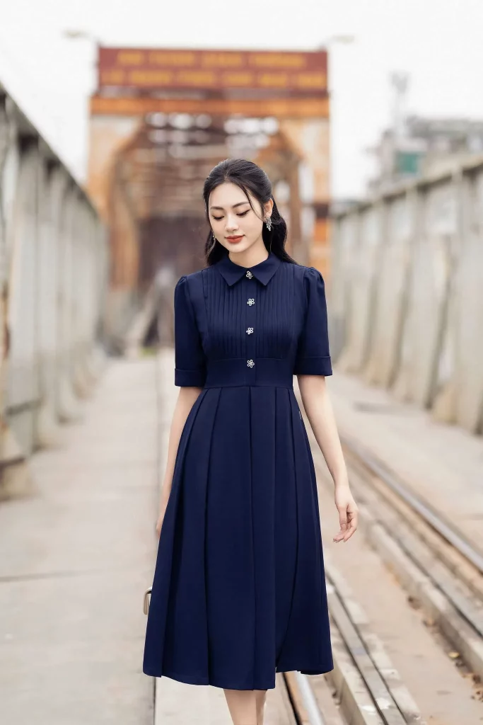 - Đầm có chi tiết cách điệu tinh tế: Các chi tiết như bèo nhún ở cổ áo, tay phồng nhẹ nhàng hay đường xếp ly tinh tế giúp chiếc đầm trở nên mềm mại và nữ tính hơn.