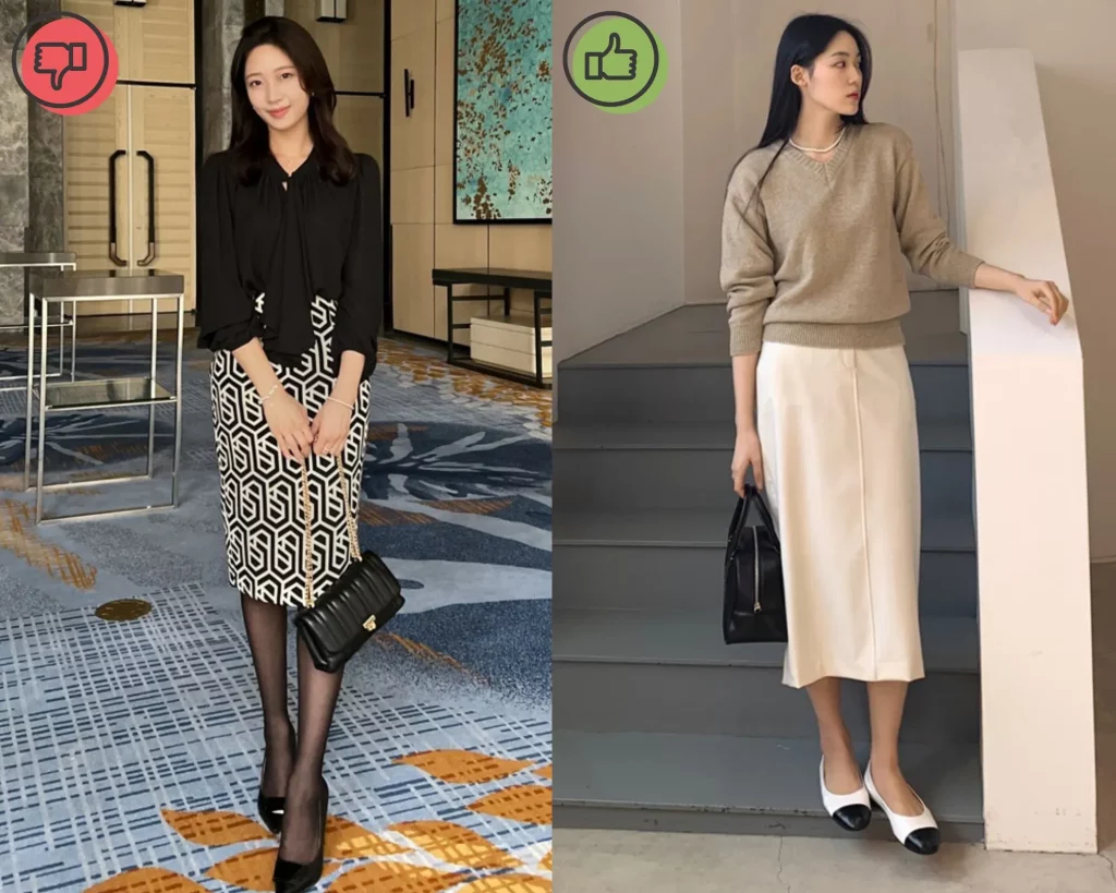 - Tránh chân váy quá ngắn hoặc quá xòe: Chân váy quá ngắn sẽ dễ khiến bạn trông “dừ” hơn, còn chân váy quá xòe lại có thể làm vóc dáng thêm phần nặng nề.