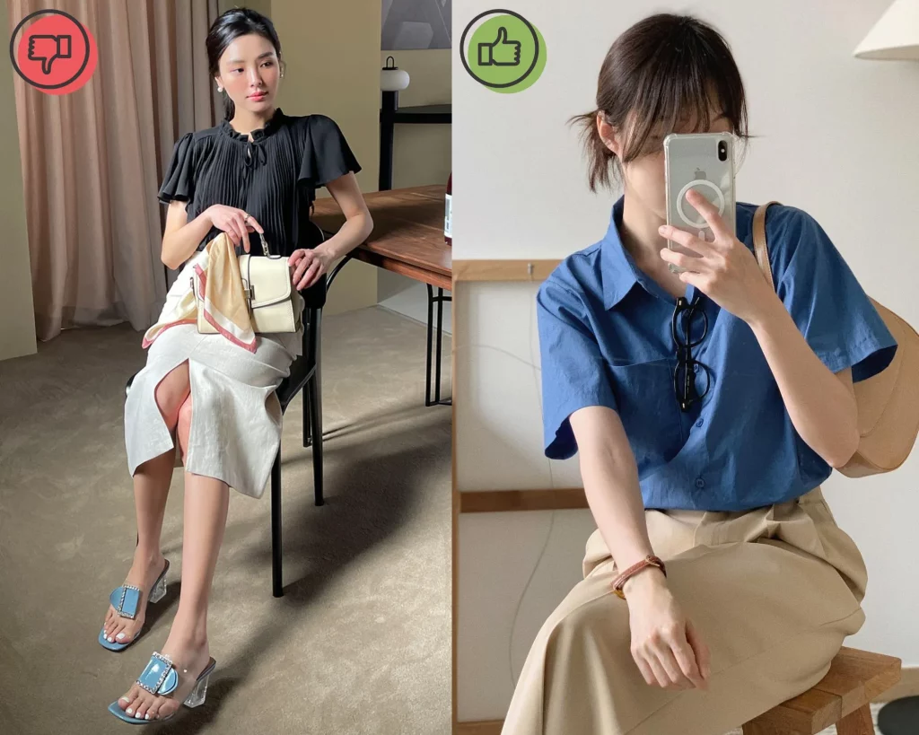 Ví dụ như bản thân mình, trước đây mình rất hay mặc những chiếc áo sơ mi oversize cho thoải mái. Nhưng sau này mình nhận ra, những chiếc áo sơ mi vừa vặn, có chiết eo nhẹ nhàng lại giúp mình trông cao hơn hẳn. Mình cũng thường chọn quần tây ống đứng hoặc quần culottes và đi thêm một đôi giày cao gót mũi nhọn nữa, trông chân dài ra đáng kể luôn!